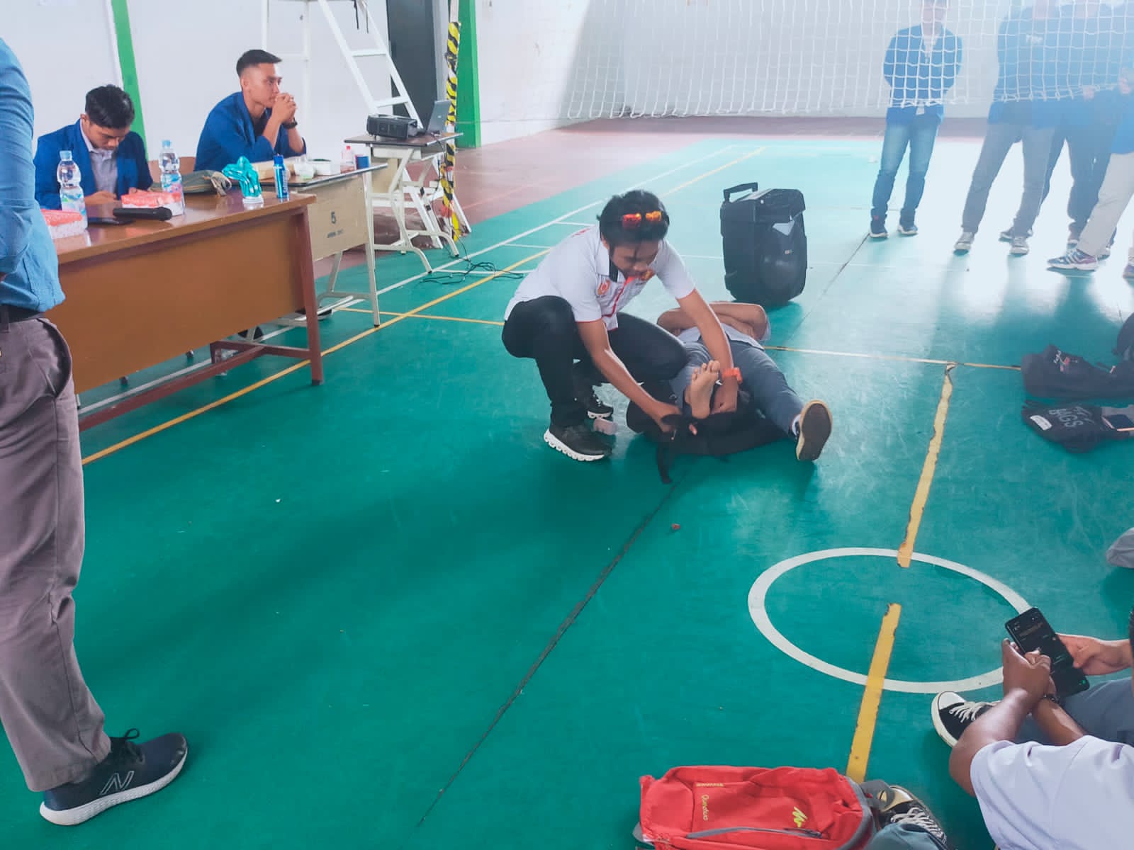 The practice of handling injuries was directly demonstrated by Wahyu as the speaker and Agus Ismail, M.Pd as head of the Physical Education Study Program, FKIP, Megarezky University.
